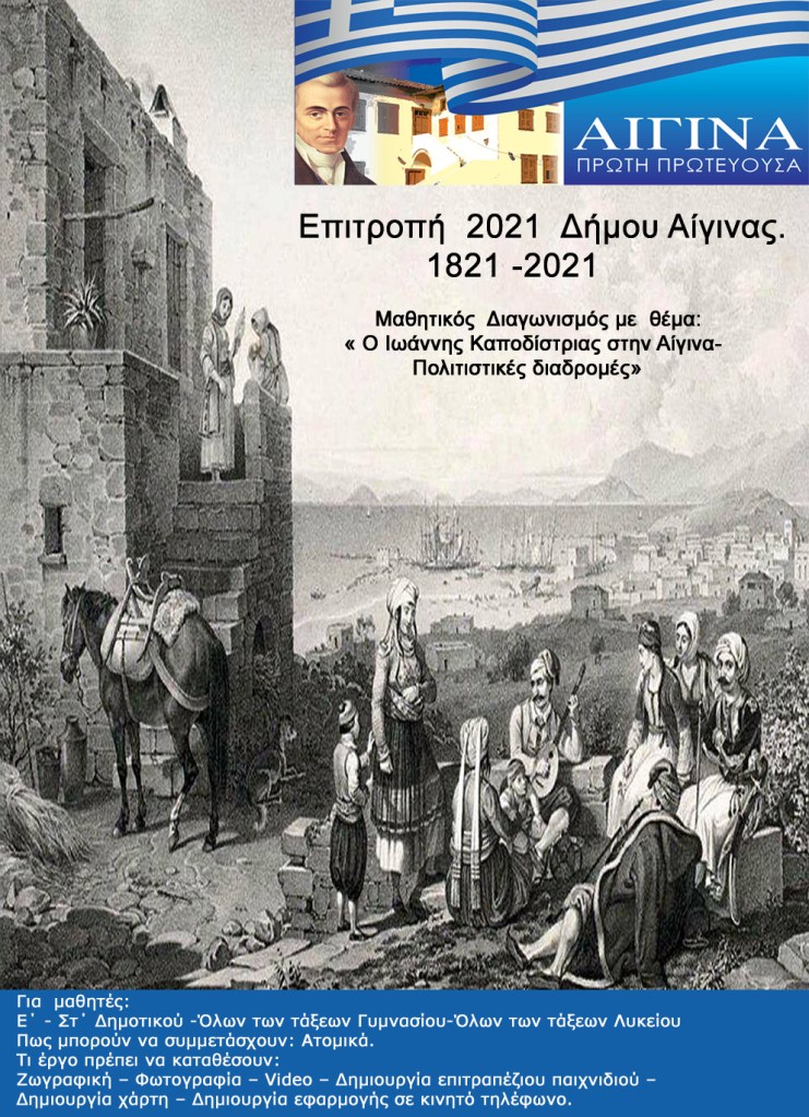 Μαθητικός διαγωνισμός με τίτλο «Ο Ιωάννης Καποδίστριας στην Αίγινα- Πολιτιστικές διαδρομές» θα πραγματοποιηθεί στο πλαίσιο του εορτασμού για την επέτειο των 200 χρόνων από την Ελληνική Επανάσταση.