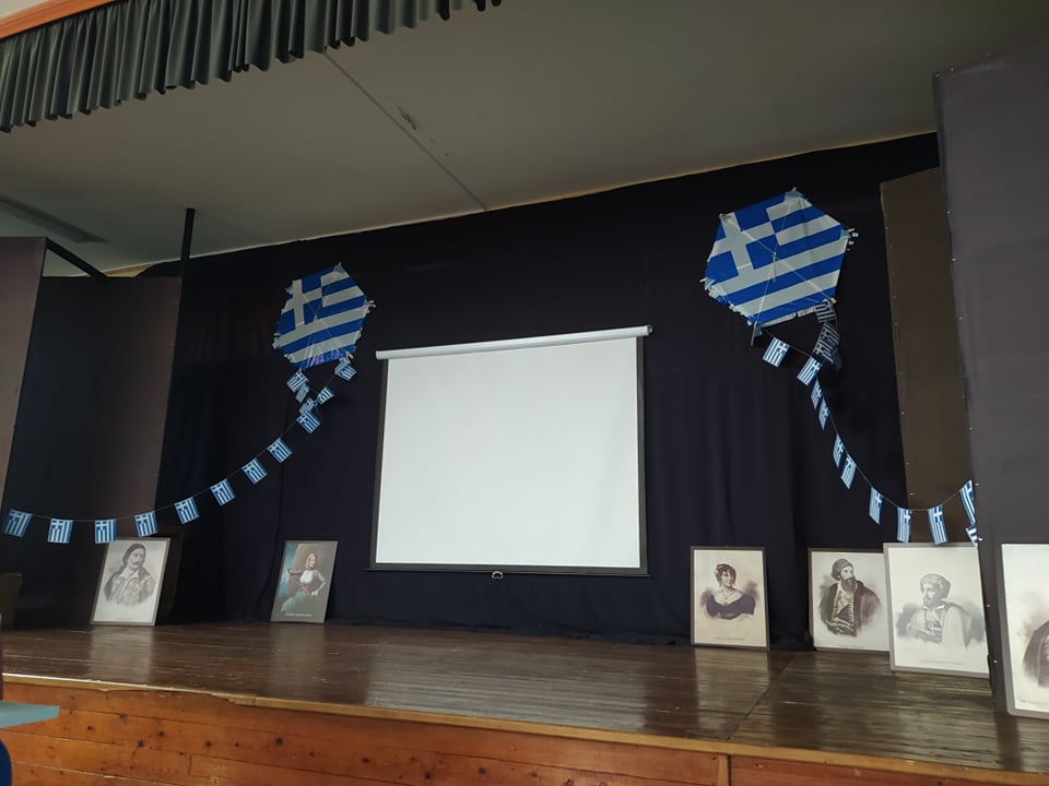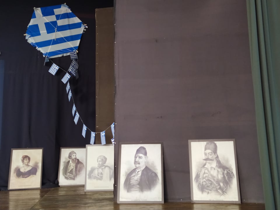 Η εορτή πλαισιώθηκε από πίνακες των ηρώων δημιουργώντας μια μικρή πινακοθήκη ηρώων στο εορταστικά στολισμένο με τις γαλανόλευκες σημαιούλες χώρο του σχολείου.