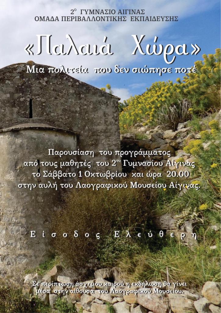 Το πρόγραμμα Περιβαλλοντικής Εκπαίδευσης που εκπόνησαν οι μαθητές και οι μαθήτριες του 2ου Γυμνασίου Αίγινας τα προηγούμενα χρόνια, παρουσιάζουν το Σάββατο 1 Οκτωβρίου και ώρα 20.00 στην αυλή του Λαογραφικού Μουσείου Αίγινας.